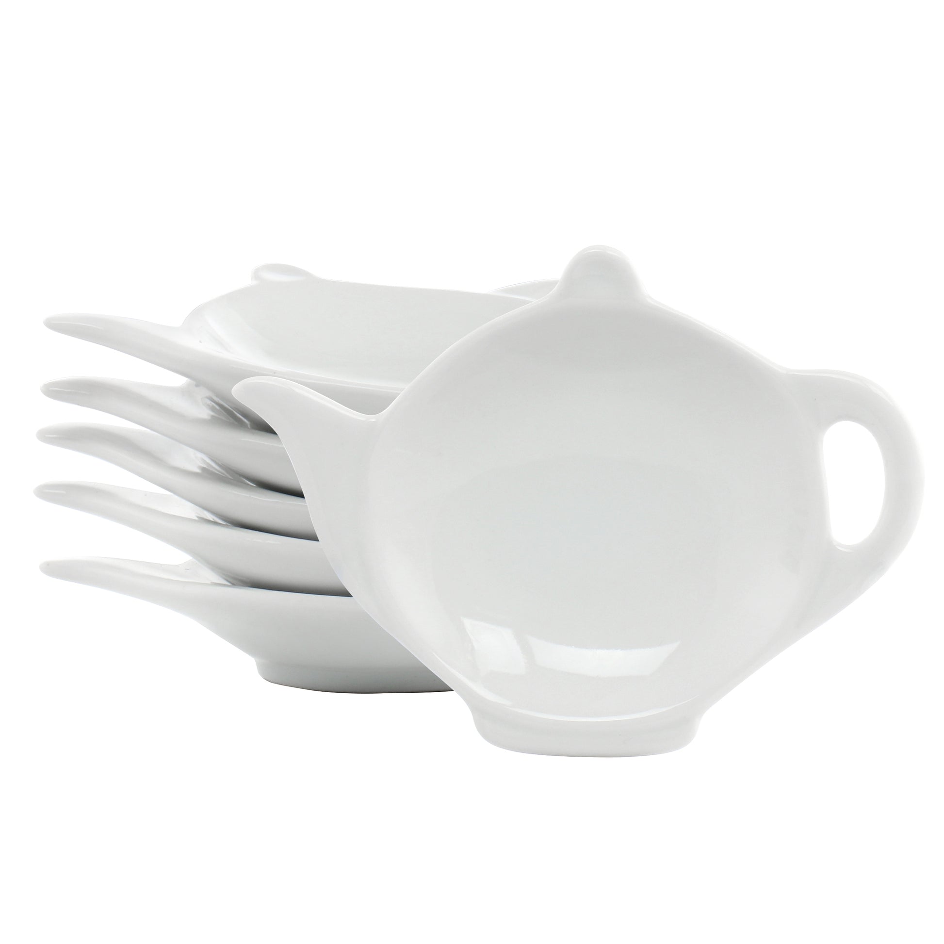 Enjoy your every day teas in piece with the Our Table Simply White 6 Piece Teapot Ceramic Tea Bag Caddy Dish Set. Featuring plates shaped as tea pots, their aesthetic matches with any tea themed moment. The fine ceramic bodies are made for everyday use, making them dishwasher safe, microwave safe, and oven safe. These small dishes have a shallow bowl like shape that is perfect for holding any used tea bags and any excess water they've soaked up. Bring out the tea caddies for a weekend brunch, for late night tea, or use them to hold small trinkets.