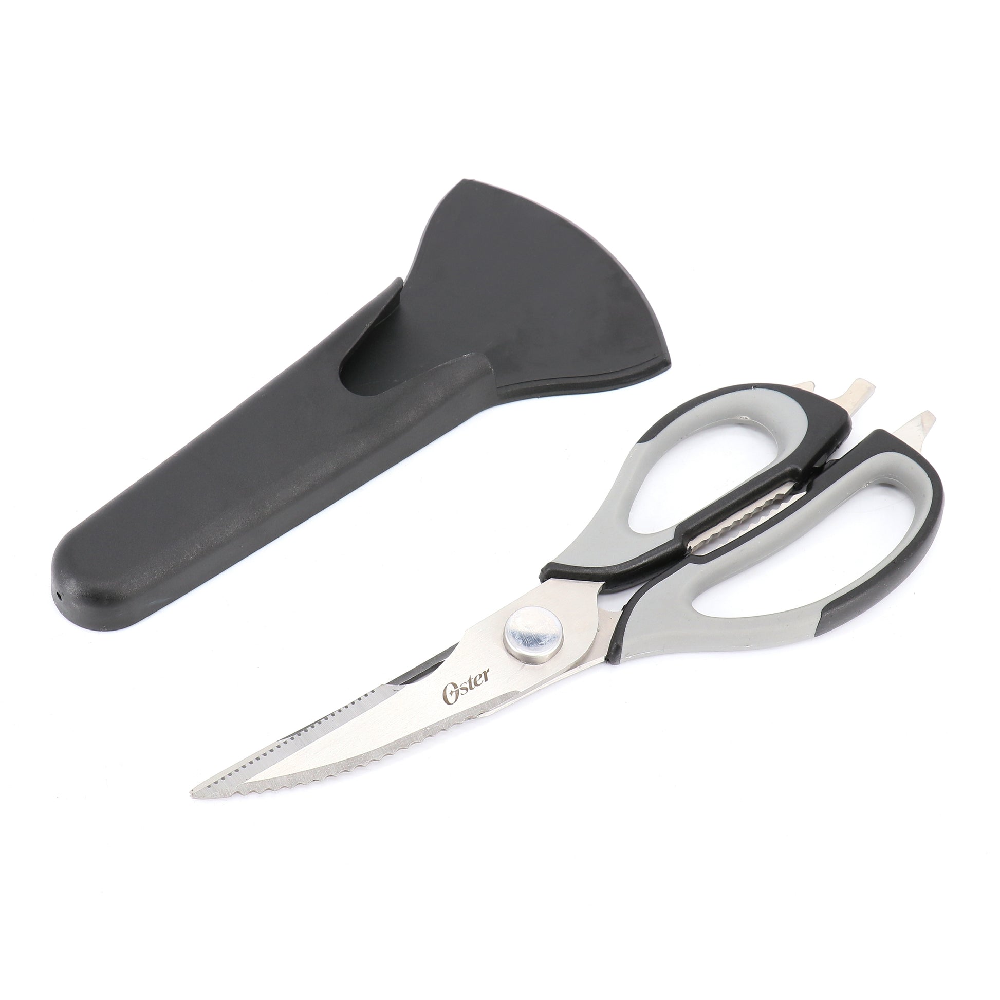 This Oster Granger 2 Piece 9 Inch Stainless Steel Multi-Purpose Scissors with Magnetic Holder is an essential in the kitchen. High carbon stainless steel slices through food with ease and a magnetic holder allows you to easily keep the scissors within reach. The multiple functions of scissors, a nutcracker, a bottle opener, and a can tab lifter makes these the perfect tool in the kitchen and around the house. Soft grip handles makes these comfortable to use in any situation. The scissor halves can be separated for easy cleaning.