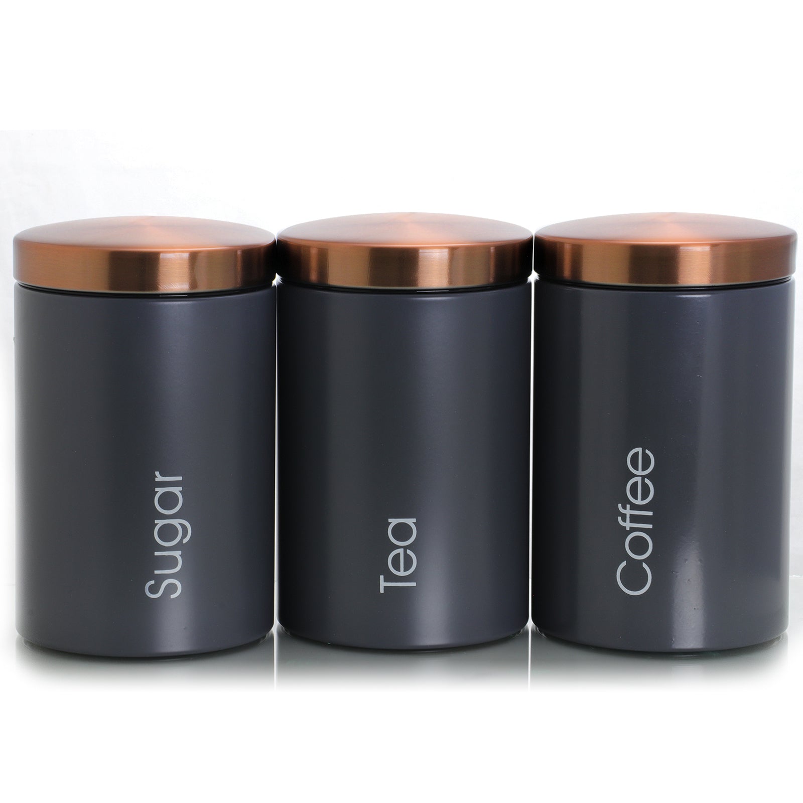 The new MegaChef Essential Kitchen Storage 3 Piece Sugar, Coffee and Tea Canister Set in Matte Gray is a stunning addition to any kitchen. The modern and minimalist design will add a subtle and useful touch of beauty and style to your counter tops. Each canister features an accented Copper Finish lid to enhance the subtle elegance of the matte finish on the canisters bodies. The canisters are conveniently labeled with the following wording for your ease of use and offers a clear display for any guest in your home and kitchen: Coffee, Sugar and Tea.